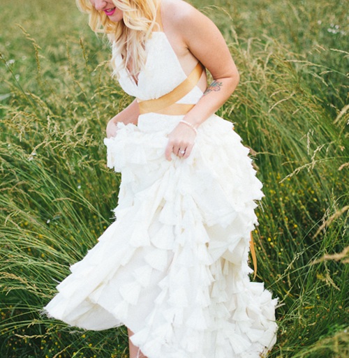 Intricate and detailed use of fabric results in such a dress that has a ruffled bottom and a backless style. Perfect for a personal outdoor wedding theme.