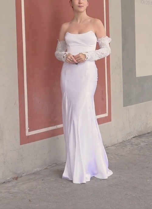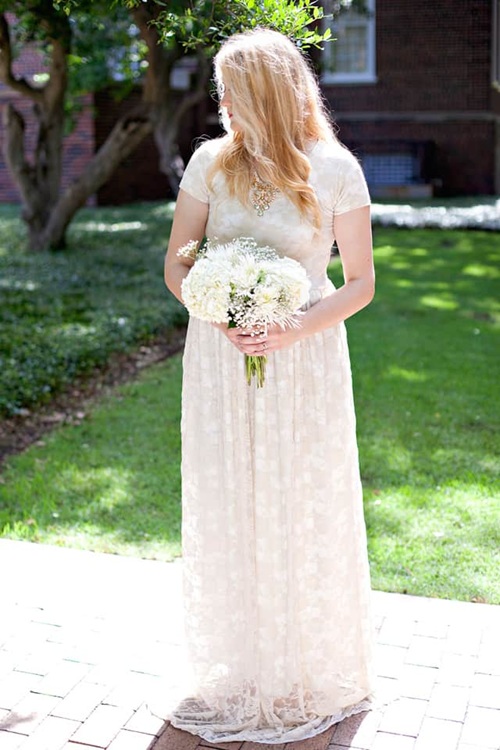 Grab your favorite lace design and stitch it together with a flowing fabric to create this delicate bridal look. It’s graceful, and every detail in it feels personal.